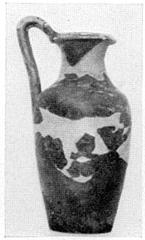 | Description: | Mended from many pieces; fragments from wall, shoulder and neck missing. Restored in plaster. Flat bottom; slender ovoid body with well defined shoulder; round mouth with flaring angular-profiled rim. Band handle rising from rim. Red glaze over outside except bottom; and on inside of rim. | |