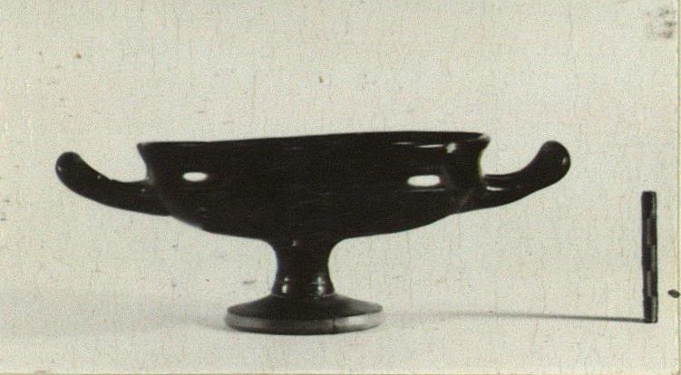 | Description: | Fragments of rim, floor and foot missing. Small cup with sharply offset rim, concave outside. Two incised grooves around base of stem. Good glaze, black to reddish, over all except handle panels and outer face and resting surface of foot. | |