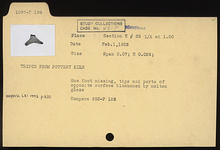 | Description: | Tripod stilt; one foot missing, tips and parts of opposite surface blackened by molten glaze. Cf. P 122. | |
