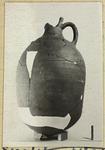 | Description: | One handle, most of lip missing; wall fragments restored in plaster. Plump, almost cylindrical body, tapering slightly to rounded bottom finished with a small knob. Narrow neck tapering to thickened lip. Dipinto in black on neck between handles: <graphic> Reddish-brown micaceous clay. | |