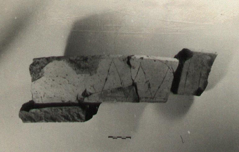 | Description: | Most of pithos still in place in the ground, with part of the rim still intact. Heavy collar rim with flat top and flat outer surface sloping in to form very sharp angle with shoulder of pithos. Two broken fragments of rim removed: a) Mended from four pieces, preserves full height of rim on outside; part of top and part of shoulder. Number scratched on outside: <graphic> b) Single non-joining fragment from outside of rim. Graffito: <graphic> Pink to gray clay with dark particles. Light finish at surface. Cf. Olynthus XII, p. 205, n. 65. | |