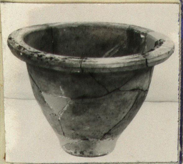 | Description: | A flower pot-shaped basin sunk in the floor; the bottom broken and about two-thirds of the floor missing; one fragment of floor found in place. Flat bottom, but apparently curved floor. Steep walls; flat-topped rim with angular profile. Unglazed light gray clay with black bits in it. | |