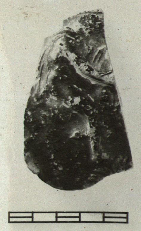 Description:   Wall fragment; a horizontal groove, unglazed, inside. In relief, a male figure (bearded?), nude except for a cloak over his shoulder, riding right on a quadruped. Herakles? Below the figure, the tip of a large palmette.