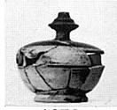 | Description: | Pieces missing from both pyxis and lid. Deep pyxis on ring foot flanged at rim to receive convex lid with downturned edges. Pointed and moulded knob handle at center of lid. Dull black glaze, somewhat peeled, over all except foot of pyxis. | |