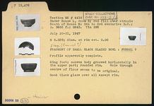 | Description: | Profile apparently complete. Ring foot; convex body grooved horizontally in its upper part; rounded rim. Hole through center of floor seems to be original. Good black glaze over all except rim. Funnel? | |