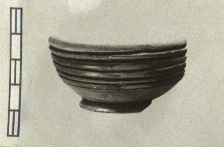 | Description: | Profile apparently complete. Ring foot; convex body grooved horizontally in its upper part; rounded rim. Hole through center of floor seems to be original. Good black glaze over all except rim. Funnel? | |
