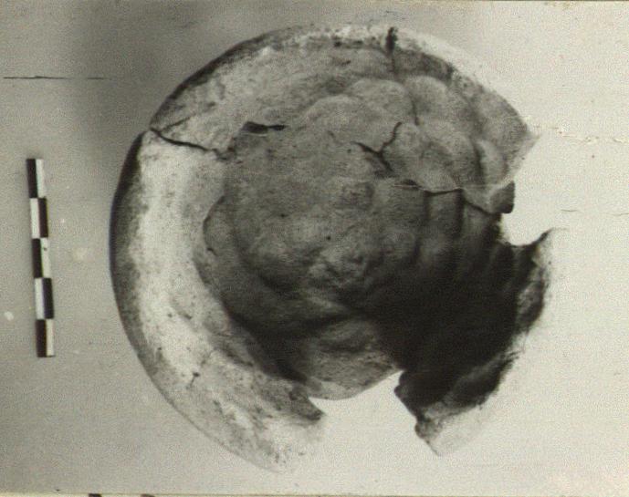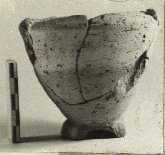 Description:   Mended from five pieces; small chips missing. Deep bowl with ring foot and plain rim; no handle. The inside pitted irregularly with rough hollows, as for a mould(?).