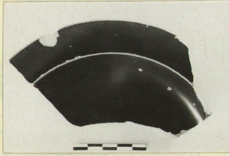 | Description: | About one-quarter preserved, to full height. Ring foot and convex body; broad projecting rim flat on top. Good black glaze over all, except line around body at junction of foot, and inner edge and resting surface of foot. | |