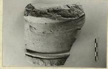 | Description: | Nearly one-quarter of the circumference and the full height preserved, of a base with moulded rings at its bottom; the wall pierced by two small round holes. A round hole through the center of the flat floor above. Heavy fabric; pinkish clay, unglazed. Cf. P 18010 (ΝΝ 3031). | |