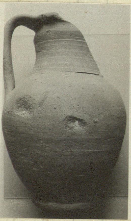 | Description: | Much of the rim and neck are broken away. Nicks in the side. One vertical, ribbon handle; groove at junction of neck and bulging shoulder; horizontal rim; low foot, flat on bottom. | |