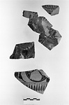 | Description: | Four fragments from the shoulder and wall of a large closed pot. Unglazed inside. On the upper shoulder, linked buds below tongues. Zeus(?) in a chariot, right, and a veiled woman; at left the tip of the hair and the drapery of another figure. Behind the team, Apollo with cithara. On a small fragment, the nose and topknot of one of the horses, and part of another(?). Red for the god's beard, eyebrow, eyeball and fillet; white for the woman's face; red for drapery borders and the horse's topknot. Very careful incision. ADDENDA Also with these, twelve additional fragments believed by the mender to belong. Cf. also P 17779. Preserved are two different lower borders of linked buds; the wheel of a chariot right, and the foot of one mounting; the rail of a chariot (not the same as on a)), and part of a figure; drapery fragments; and a hand holding a chariot rail. Red borders on the drapery, and red folds. Decoration also of groups of white dots and incised crosses. | |