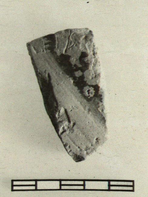 | Description: | From the wall of a heavy coarse pot, covered outside with streaky black glazed bands. Incised outside: <graphic> | |