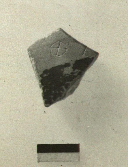 | Description: | From the wall of a cup, glazed inside, apparently with a reserved handle zone outside. Glaze black inside; reddish-brown outside. Incised outside: <graphic> | |