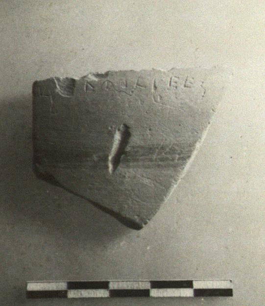 | Description: | From the wall of a semi-glazed krater. Black glaze inside; band outside. Incised outside: <graphic> | |