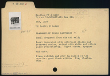 Description:   Small fragment from rim and wall. Panel decorated with alternate glazed and reserved scales, veined with white and dilute glaze respectively. Upper border, tongues and dot.
