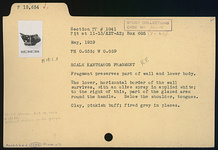 | Description: | Fragment preserves part of wall and lower body. The lower, horizontal border of the wall survives, with an olive spray in applied white; to the right of this, part of the glazed area around the handle. Below the shoulder, tongues. Clay, pinkish-buff; fired gray in places. | |