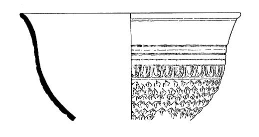 | Description: | Three joining fragments giving part of lip and upper wall. Small imbricated leaves on wall; band of egg and dart above, with grooves about that. Scraped groove at top of lip. Pinkish-brown clay; dull worn black glaze. | |