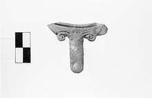 Description:   Part of the rim, with the upper part of the vertical loop handle, surmounted by an outward pointing finger; volutes along rim at base of handle.