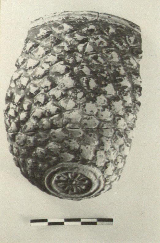 | Description: | About one-fifth of bowl preserved, profile complete. Restored in plaster. Steep wall; plain vertical rim. Groove bordered by ridges just under lip. Wall completely covered with nodules. Eight-petalled rosette with petals separated by "spokes" as medallion; surrounded by groove and ridge. Dark buff clay, worn and pitted inside. Poor black glaze. | |