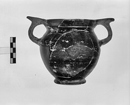 | Description: | Much of rim and body missing; restored in plaster. Lip flares slightly with pronounced ridge below. Globular body and thin, slightly spreading ring foot. Ring handles with pronounced spurs. Dark buff clay, dull black glaze. | |