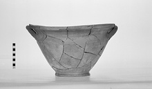 | Description: | Small part of rim and wall missing. Profiled lip with groove around interior. Horizontally placed handles, round in section rising to touch outer edge of lip. Body incurving from base of handles to low, slightly convex ring foot. Buff clay with lavender core; traces of brown glaze on interior. Pot compressed out of shape in firing. | |