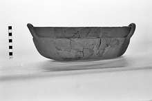 | Description: | About one-fourth of lip and wall and handle missing; restored in plaster. Lip slightly convex in profile set off from wall by groove, and flanged for cover on interior. Wall curves gently to flat bottom. Handle round in section, horizontally placed below lip, rises to just above lip and adheres to it. Highly micaceous gray clay fired red on exterior. | |