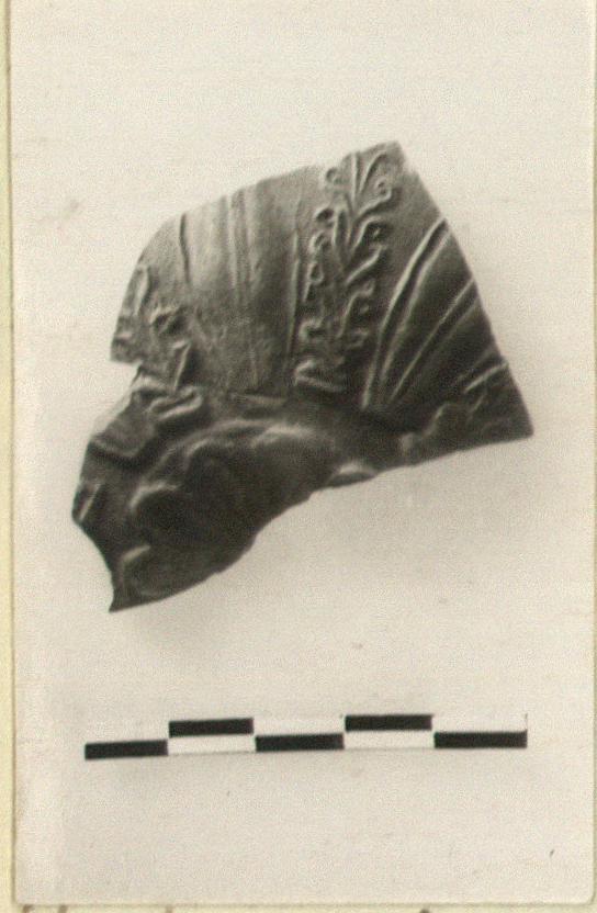 | Description: | Mended from two pieces. Part of medallion and lower body preserved. Medallion: parts of five petals of rosette. Body: alternately a large lanceolate leaf with midrib and a plant with incurving and outcurving tendrils. Hard dark gray clay. Probably unglazed. ADDENDA Probably non-Attic [GRE]. | |