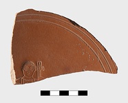 | Description: | Late Roman B plate fragment. Preserves head and shoulders of a figure, perhaps a priest, with left hand next to his shoulder holding a Latin cross which touches his head. He seems to be wearing a surplice. The eyes are large and round and the hair rendered by neat vertical strokes within the head line. Stamped or drawn very neatly in the wet clay. The figure is part of the center ornament of a thick flat dish that is broken neatly around the edge; two parallel concentric grooves run near the edge. Coarse red clay, lustrous red wash inside. | |