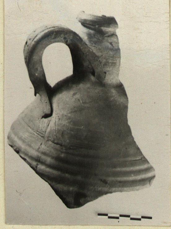 | Description: | Part of narrow neck and sloping shoulder with ridged band handle. Graffito below lower handle attachment: <graphic> Thin gray-brown micaceous clay. | |