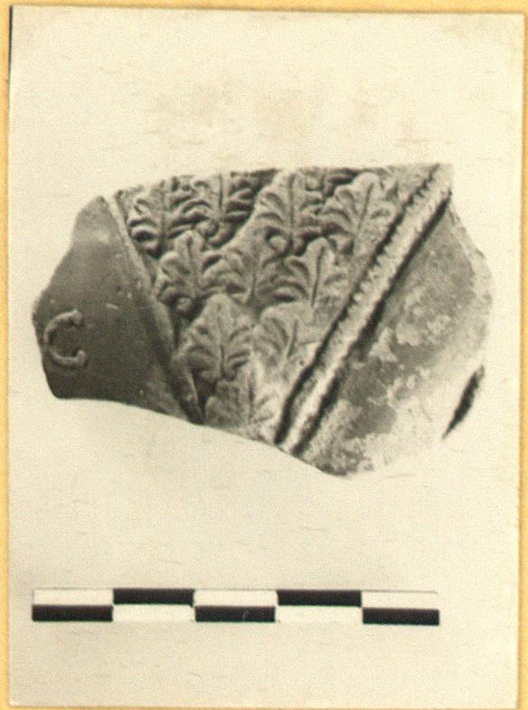 | Description: | Fragment from the wall of a bowl(?). Triangle of palmettes in relief; a plain zone with rope border to either side. Last letter of inscription at left. Rather soft orange-buff clay, poor red glaze inside and out. | |