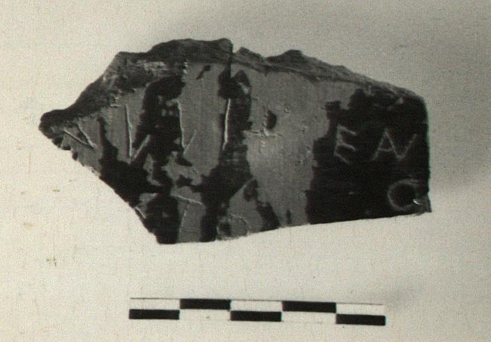 | Description: | Two joining pieces from wall of semi-glazed krater. Incised inside: <graphic> Glazed inside, red to black and considerably peeled; thin glaze wash outside and one red band. | |