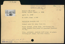 Fine polished pinkish-buff clay; no glaze. Cooking pot shape, but fine fabric.