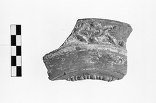 | Description: | Small fragment from rim and wall of a large lid with flat projecting rim, rounded wall and sunken top. On the rim a moulded garland; two grooves around the wall; bead and reel around the top. Fine light brown clay; remains of white slip and of pink and yellow paint. | |