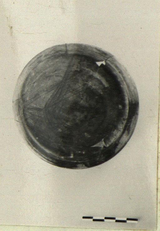 | Description: | Complete except for two chips from floor. Interior flat with slightly raised and thickened rim, rounded on top. On floor two faint bands of rouletting. Exterior profiled. Ring foot, grooved beneath. Thin dull black glaze over all. | |