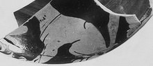 Description:   About one-quarter preserved of a squat askos, with a trace of a raised edge the upper break. Flat bottom, reserved. On the top, a dog, seated left, towards a volute plant.