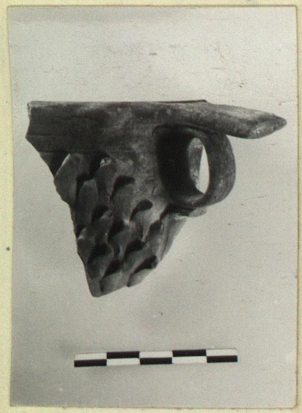 | Description: | Rim and wall fragment with loop handle below a horizontal thumb-rest. Triangular leaves in high relief pointing. Edge of rim scalloped. Thin fabric, red at core and on inside, brown to red on outside. | |