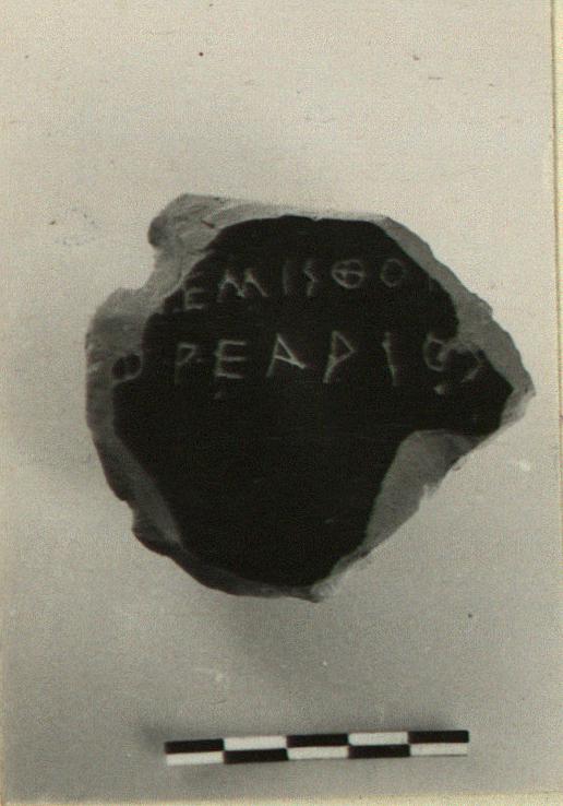 | Description: | Part of the floor of a black glazed kylix, the stem broken off below. Incised on floor: ΘΕΜΙΣΘΟΚ[ΛΕΣ] ΦΡΕΑΡΙΟΣ | |