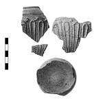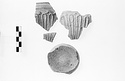 Description:   Most of the foot preserved, with the center of the floor, and three non-joining fragments of rim and wall. Moulded bowl on a ring foot, shaped like a Megarian bowl and decorated with long petals, jewelled between in relief.