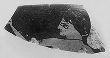 Description:   From rim. Head and shoulders of nude youth, seen from behind, facing left; left arm outstretched.