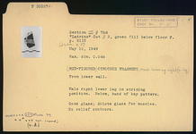 | Description: | From lower wall. Male right lower leg in striding position. Below, band of key pattern. Good glaze; dilute glaze for muscles. No relief contours. | |