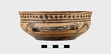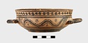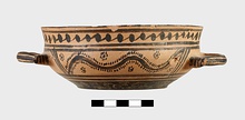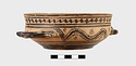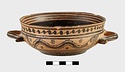 | Description: | Flat bottom, slight shoulder, straight vertical rim; rolled handles with out-turned ends. In panel between handles wavy glaze line bordered by dots; dot-rosettes as filling ornament below, two stripes and solid glaze to base. On rim, tangent dots. Interior glazed, but for reserved stripes inside rim. Pinkish-buff clay; glaze black to brownish. | |