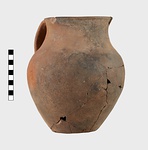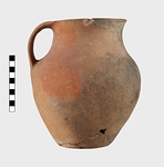 | Description: | A few chips missing from body. Flat bottom; shoulder relatively high passing in gentle curve into short neck and flaring rim. Wide strap handle rim to shoulder. Unglazed; surface wet-smoothed. Fired buff to red. Smoke-blackened from use. | |