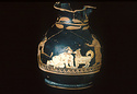 | Description: | Back of neck and handle missing; and scraps. Around the neck, olive wreath; ground line, egg and dot. The scene shows three children at play, with a dog; at left a nude boy, right, leaning forward, taking a stick to a small child crawling right to kiss a curly-tailed dog; at right, a boy wearing a himation, his right hand outstretched to the child. White for child and dot, with yellow drawing over; added clay for fillets. Firm black glaze; the resting surface and the space within the foot reserved. | |