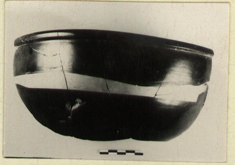 | Description: | Part of wall and rim preserved; nothing of the foot. Deep open bowl, the wall drawn in slightly at the top. Heavy rolled rim, projecting outside. Trace of handle attachment at break. Firm black glaze inside and out; a broad reserved band in the handle zone outside, very irregularly done. Oval bowl? The rim not round. | |