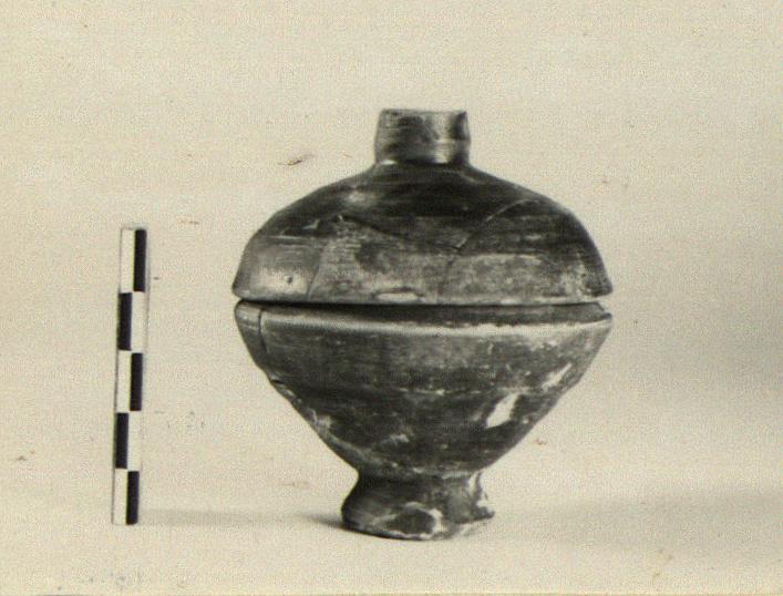 | Description: | [Originally identified a pyxis.] Mended complete. Small pyxis on a solid flared base; the rim inset to receive the convex lid; a knob handle on top. Thin dull glaze, black to brown, over all. | |