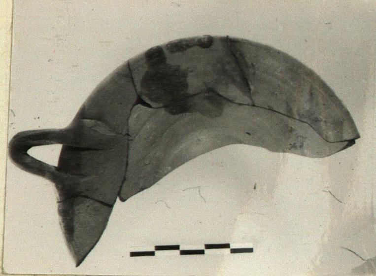 | Description: | Fragment of a plate, including one handle. Exactly similar to P 20145 (ΠΠ 788). ADDENDA P 20145: Flat bottom and rather deep body; horizontal band handles added against rim. Unglazed except for handles and areas around their attachments, inside and out, smeared with thin dull black glaze. | |