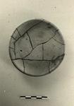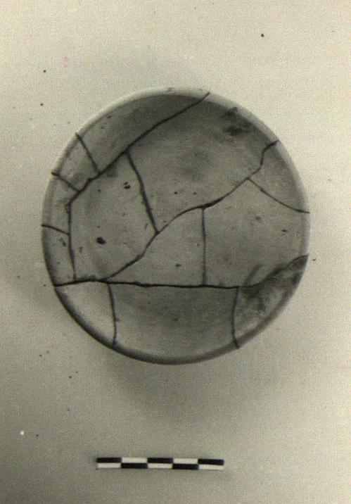 Description:   Mended complete. Roughly wheel made saucer with flat bottom, plain rim, shallow flat floor.