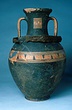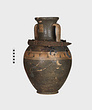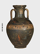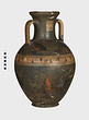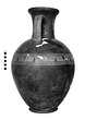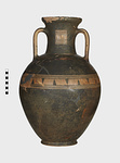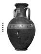 | Description: | Cracked and broken in removal from grave. Complete but for chips. Heavy egg-shaped body, small flaring foot. Neck sharply offset from shoulder, slightly concave in profile, flaring up to deep thickened rim. Handles, neck to shoulder. Small reserved panel on neck containing segment of battlement maeander; above and below, zigzags. Belly stripe, opposed lines. Handles, herringbone; above and below, horizontal lines. Pinkish-buff clay. Glaze black, somewhat metallic. Iron stain on shoulder and one handle from sword wrapped around it (IL 1058). | |