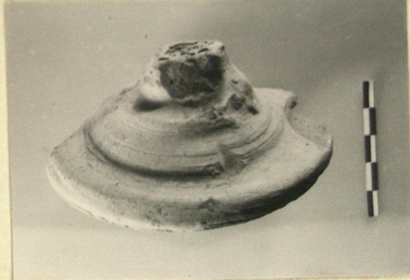 | Description: | About half of edge missing; knob chipped. Restored in plaster. Roughly stepped profile rising to crude knob. Buff clay. Lighter slip. | |