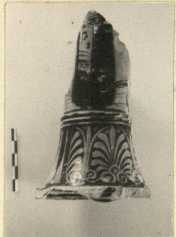 | Description: | Lower part of neck preserved. Around bottom, a wide band of ornament: at the front a single palmette framed by lotuses and with one-half palmette on either side; around the back, rays; above are the lower parts of two draped standing female figures facing. The left-hand figure holds a wide scarf with white fringe. A pair of moulded ridges above and below the ornament band. Careful relief contour for ornament only. Later 5th c. B.C.; something as the Painter of the Athens Wedding. | |